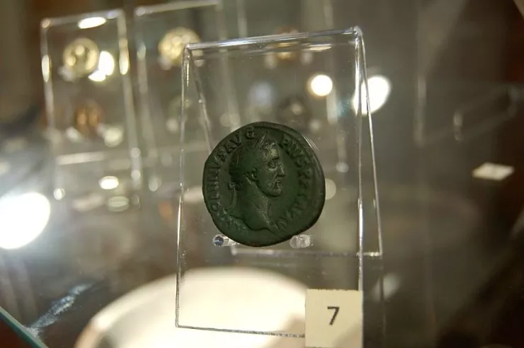 Ta ważąca 28 g. sestercja jest największą monetą eksponowaną obecnie w ostródzkim muzeum. Wybita została w Rzymie za czasów cesarza Antoninusa Piusa, rządzącego w latach 138-161. W tamtym czasie za monetę tego typu można było kupić wyżywienie dla jednej osoby na okres dwóch dni.