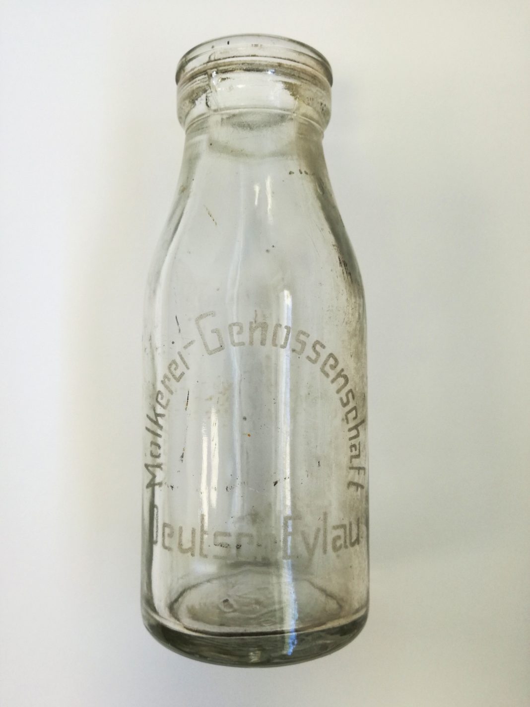 Szklana butelka na mleko z iławskiej mleczarni, z sygnaturą Molkerei-Genossenschaft Deutsch Eylau. Siedziba mleczarni znajdowała się dokładnie w tym samym miejscu, w którym zakład funkcjonował po wojnie, czyli przy dzisiejszej ulicy Królowej Jadwigi, a dawnej Dworcowej-Lubawskiej.