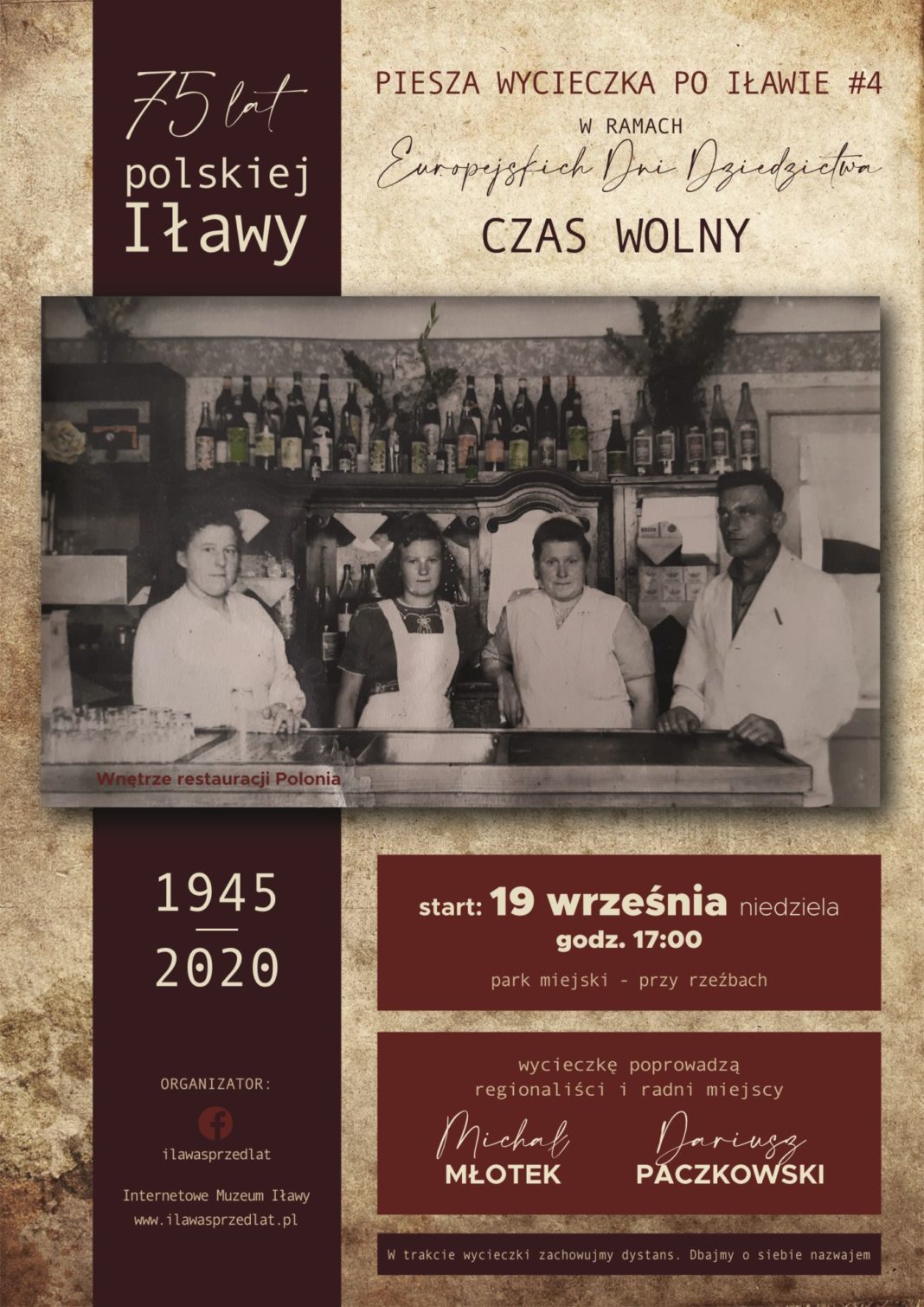 Kolejna wycieczka, która zatytułowana została „Wolny czas”, opowie o miejscach, w których pierwsi powojenni mieszkańcy spędzali czas po pracy. Michał Młotek i Dariusz Paczkowski zabiorą uczestników spaceru do miejsc, gdzie znajdowały się pierwsze bary, restauracje i hotele, między innymi słynna na całą okolicę restauracja „Polonia”, którą kierował Feliks Wróblewski. Warto dodać, że w wycieczce wezmą udział synowie Feliksa Wróblewskiego, którzy specjalnie tego dnia przyjadą do Iławy. Część wycieczki zostanie poświęcona tematowi odgruzowania Iławy.